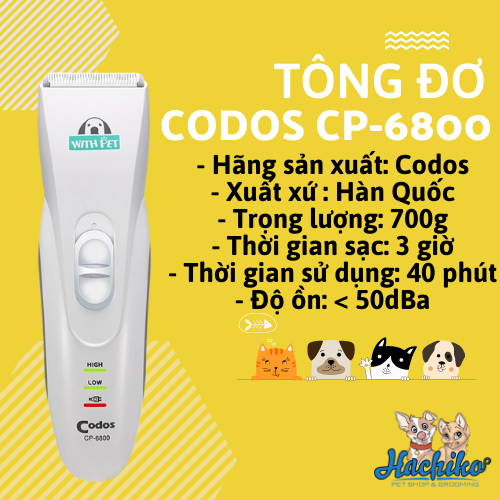 - Chiếc tông đơ codos cp 6800 với động cơ mạnh mẽ, chạy cực êm sẽ không làm cún iu hoảng sợ. Lưỡi dao bằng sứ Titanium, sắc bén cắt rất “ngọt”, đảm bảo không có hiện tượng nhâm, ngậm lông, hoặc đứng máy khi gặp chùm lông dày. Chỉ trong 20 phút, chú cún của bạn sẽ được thay kiểu lông mới cực xinh xắn.