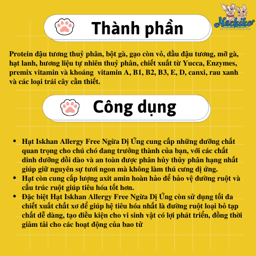 - Hạt Iskhan Allergy Free Ngừa Dị Ứng cung cấp những dưỡng chất quan trọng cho chú chó đang trưởng thành của bạn, với các chất dinh dưỡng dồi dào và an toàn được phân hủy thủy phân hạng nhất giúp giữ nguyên sự tươi ngon mà không làm thú cưng dị ứng.