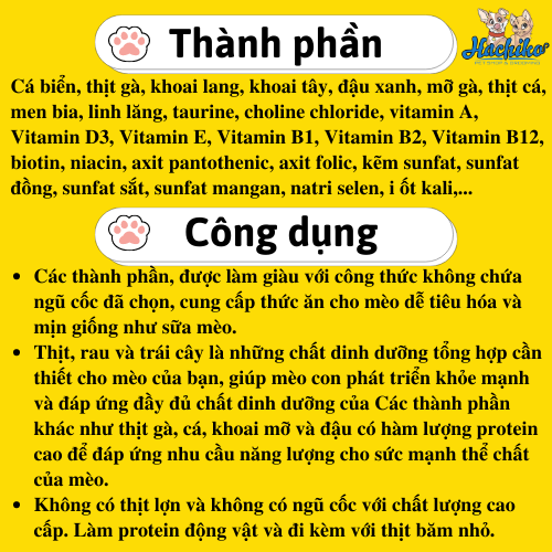THÀNH PHẦN: Cá biển, thịt gà, khoai lang, khoai tây, đậu xanh, mỡ gà, thịt cá, men bia, linh lăng, taurine, choline chloride, vitamin A, Vitamin D3, Vitamin E, Vitamin B1, Vitamin B2, Vitamin B12, biotin, niacin, axit pantothenic, axit folic, kẽm sunfat, sunfat đồng, sunfat sắt, sunfat mangan, natri selen, i ốt kali,...