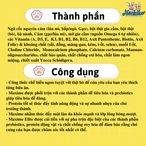 - Maxime Elite được cải tiến với sự pha trộn đặc biệt của các thành phần prebiotics, protein động vật và chất chống oxy hóa để đảm bảo rằng chó cưng của bạn được chăm sóc tốt nhất có thể.
