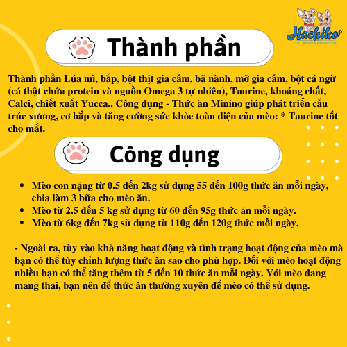 THÀNH PHẦN: Thành phần Lúa mì, bắp, bột thịt gia cầm, bã nành, mỡ gia cầm, bột cá ngừ (cá thật chứa protein và nguồn Omega 3 tự nhiên), Taurine, khoáng chất, Calci, chiết xuất Yucca.. Công dụng - Thức ăn Minino giúp phát triển cấu trúc xương, cơ bắp và tăng cường sức khỏe toàn diện của mèo: * Taurine tốt cho mắt.