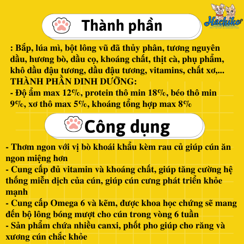 THÀNH PHẦN: Bắp, lúa mì, bột lông vũ đã thủy phân, tương nguyên dầu, hương bò, dầu cọ, khoáng chất, thịt cà, phụ phẩm, khô dầu đậu tương, dầu đậu tương, vitamins, chất xơ,...