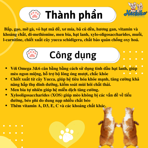 THÀNH PHẦN: Bắp, gạo, mỡ gà, vỏ hạt mã đề, xơ mía, bã củ dền, hương gan, vitamin và khoáng chất, di-methionine, men bia, hạt lanh, xylo-oligosaccharides, muối, l-carnitine, chiết xuất cây yucca schidigera, chất bảo quản chống oxy hoá.