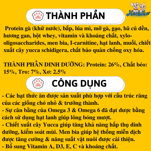 - Các hạt thức ăn được sản xuất phù hợp với cấu trúc răng của các giống chó nhỏ & trưởng thành.