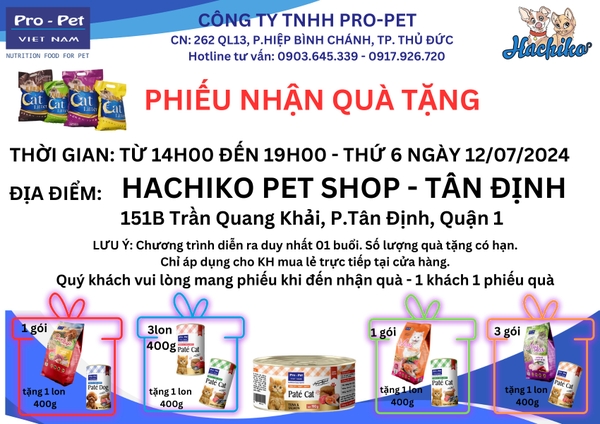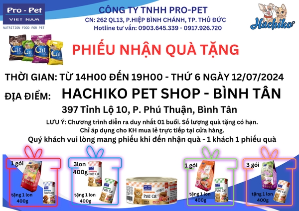 Mang phiếu đến Hachiko 151B Trần Quang Khải Quận 1 và 397 Tỉnh Lộ 10 Bình Tân sẽ nhận được quà từ Pro-Pet