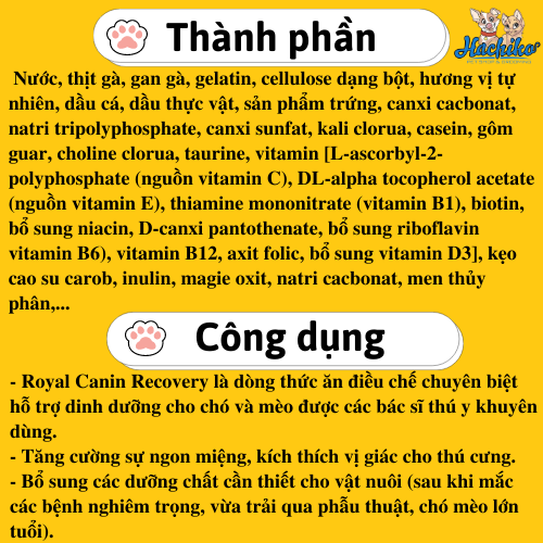 - Royal Canin Recovery là dòng thức ăn điều chế chuyên biệt hỗ trợ dinh dưỡng cho chó và mèo được các bác sĩ thú y khuyên dùng.