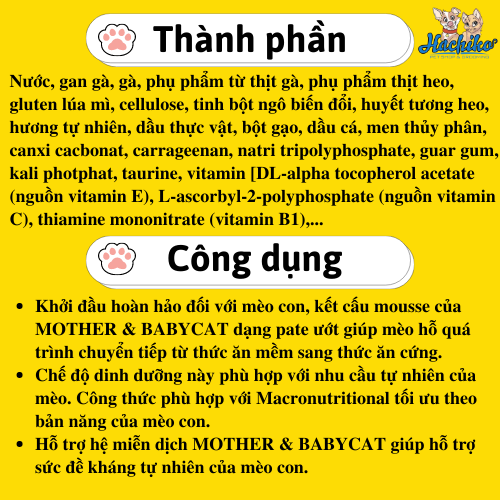 - Khởi đầu hoàn hảo đối với mèo con, kết cấu mousse của MOTHER & BABYCAT dạng pate ướt giúp mèo hỗ quá trình chuyển tiếp từ thức ăn mềm sang thức ăn cứng.