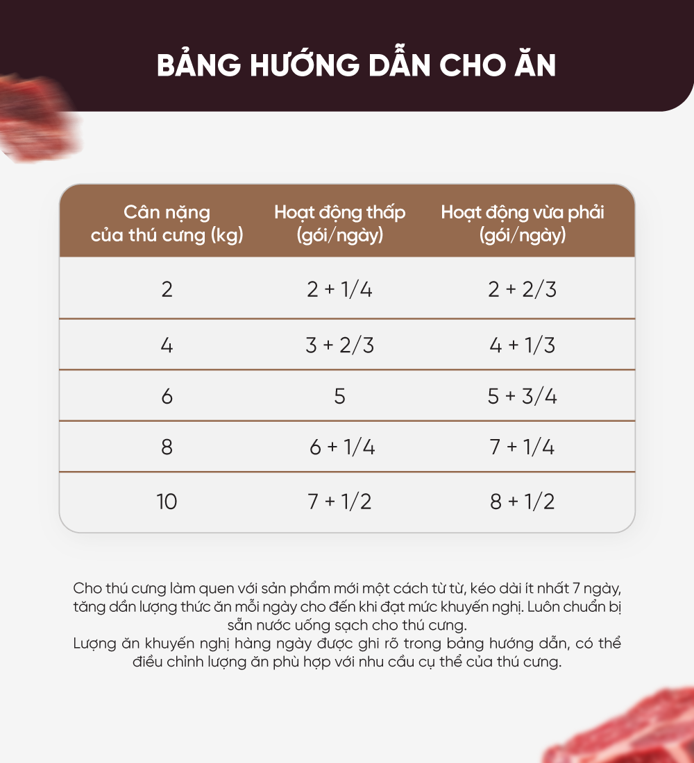 Cung cấp protein chất lượng cao từ thịt tươi, hỗ trợ phát triển cơ bắp săn chắc và năng lượng dồi dào cho các giống chó nhỏ.