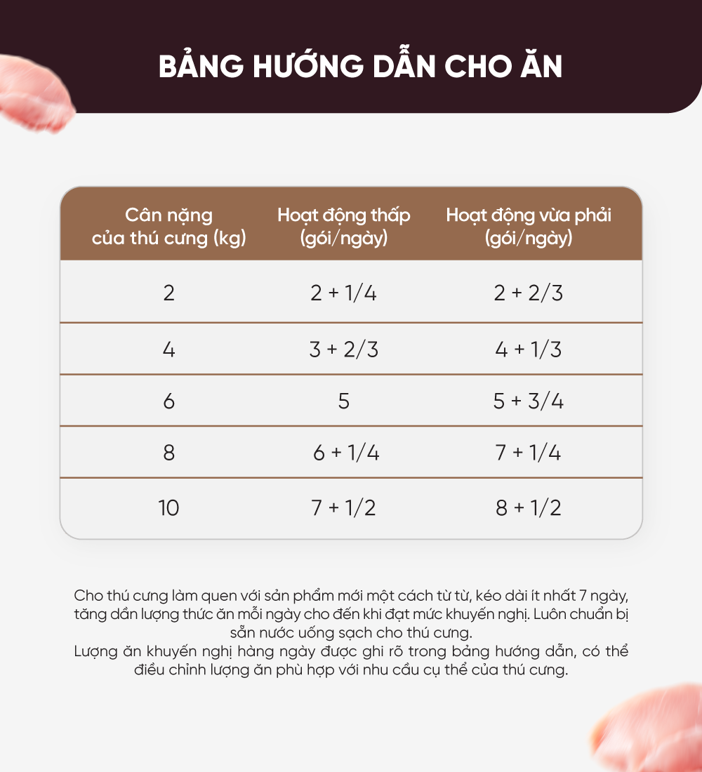Sử dụng ức gà tươi mềm, giàu protein, kết hợp với xốt thơm ngon, mang đến bữa ăn bổ dưỡng và kích thích vị giác cho thú cưng.